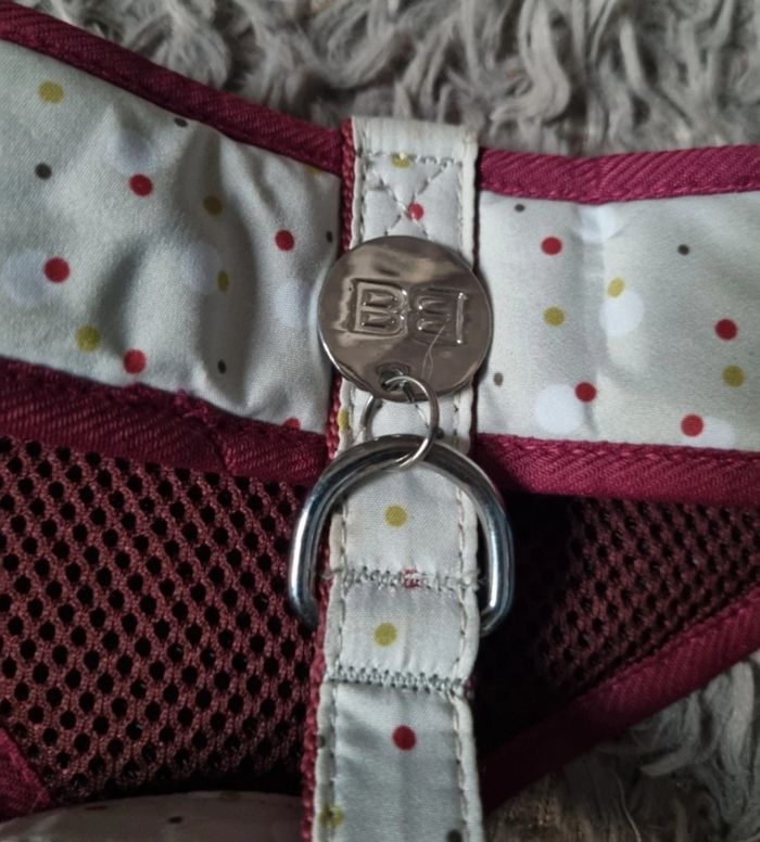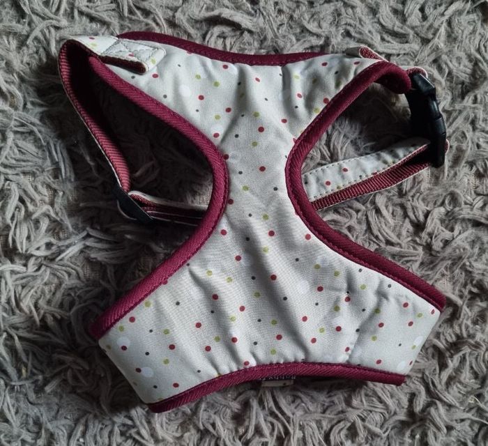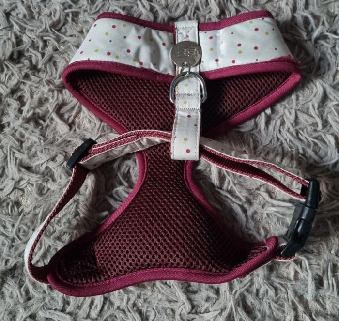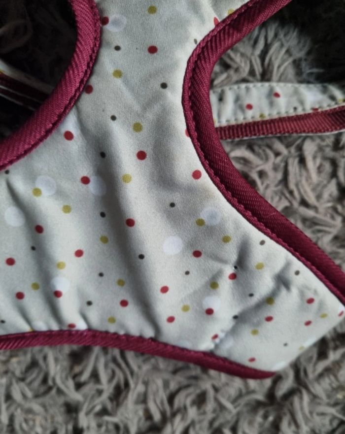 Harnais vert pastel et violet à pois ,marque Bobby taille M,tour de cou environ 33-34cm,largeur taille 26cm jusqu'à 57cm,mini trou voir dernière photo.