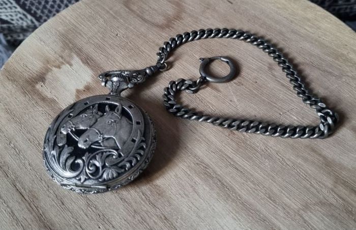 Voici une magnifique montre de poche vintage avec un motif de chevaux sur les deux faces. La chaîne mesure 28 cm de long et la marque est Précis. Malheureusement, elle n'a pas été utilisée depuis un bon moment et nécessite donc une remise en état de fonctionnement. C'est une pièce unique et pleine de charme qui fera le bonheur d'un collectionneur ou d'un amateur de belles montres anciennes.