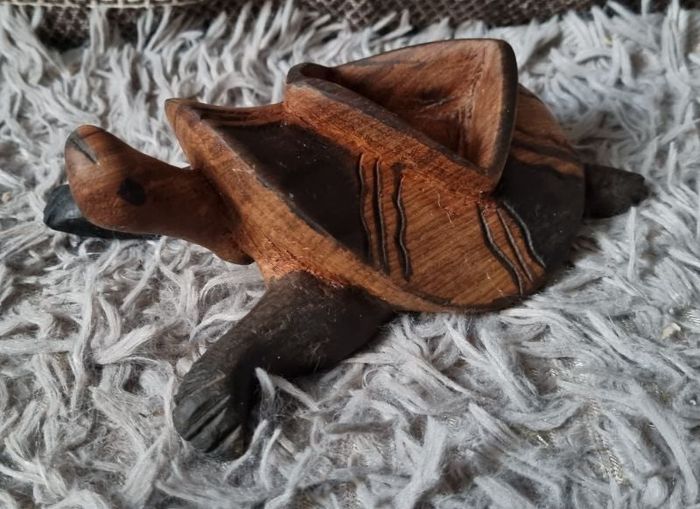 Décoration tortue en bois sculptée, peu servir de vide poches ou de cendrier, longueur 17cm, largeur 12cm.
