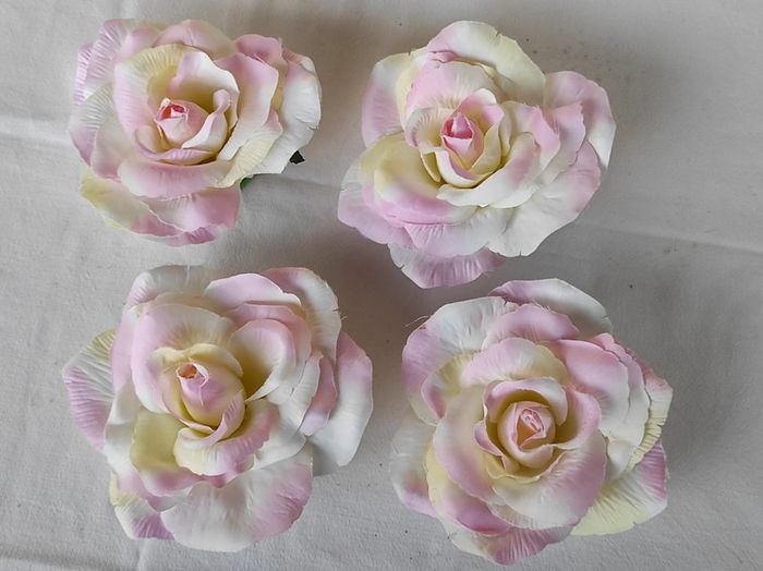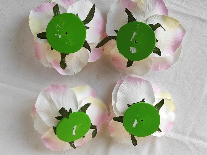 Vends 4 fleurs en tissu décoratives Diamètre 13 cm Support en mousse vert Très bon état