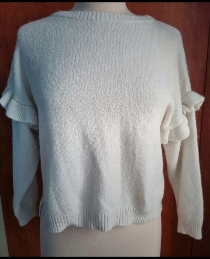 Pull effet pelucheux avec volants aux épaules, taille XS marque Morgan, longueur 48cm, largeur 48cm, longueur épaule à aisselle 20cm, largeur aisselle à aisselle 50cm, longueur manche 37cm,blanc crème pailleté, mini trous recousu voir dernière photo.
