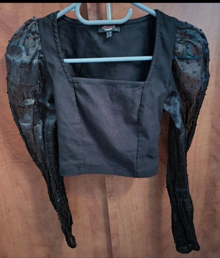 Top noir manches transparent, taille XS marque Jennyfer, longueur 35cm, largeur 29cm, longueur manche 59cm,longueur épaule à aisselle 19cm,effet pelucheux aux manches.