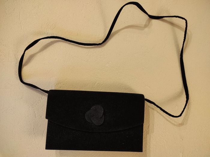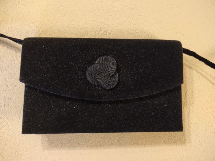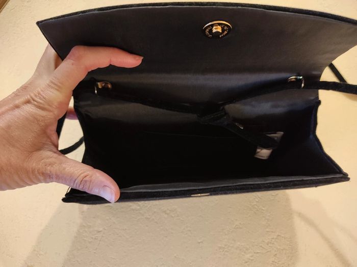 Vends pochette velours noir Une longe pour pouvoir le porter en sac sur l'épaule Une poche intérieure 23 x 14 cm Épaisseur 3 cm Excellent état