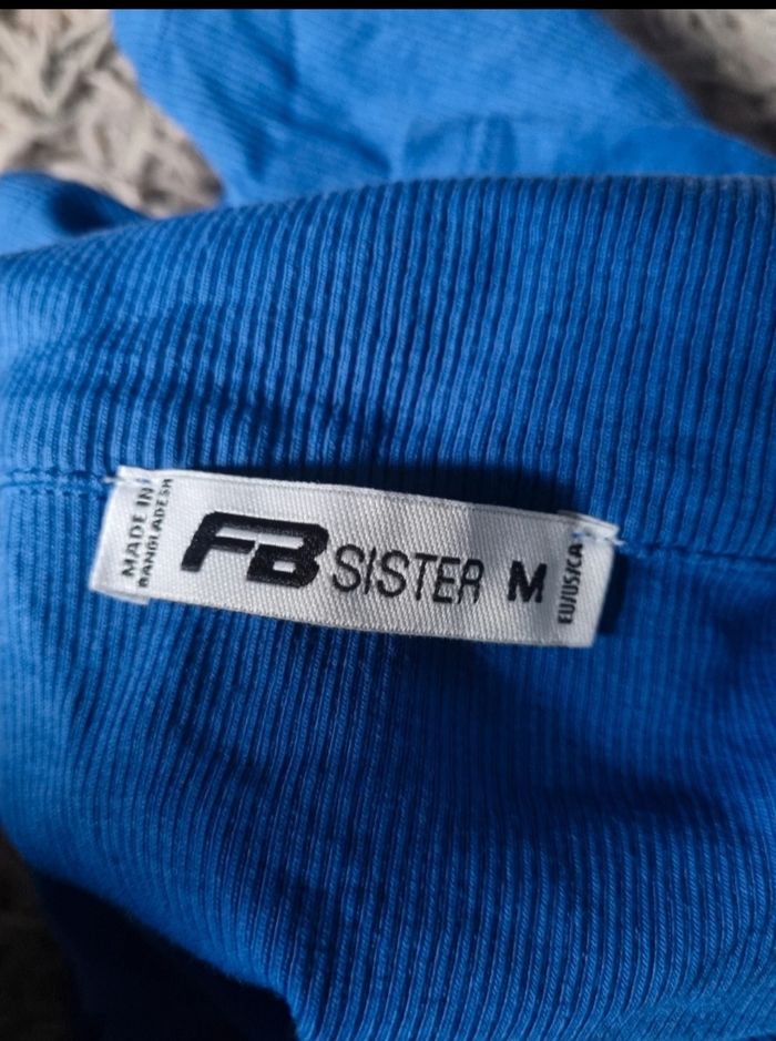 T-shirt court bleu côtelé à col boutonnée, taille M marque FB Sister, longueur 42cm, largeur 34cm, longueur épaule à aisselle 18cm, largeur aisselle à aisselle 39cm.