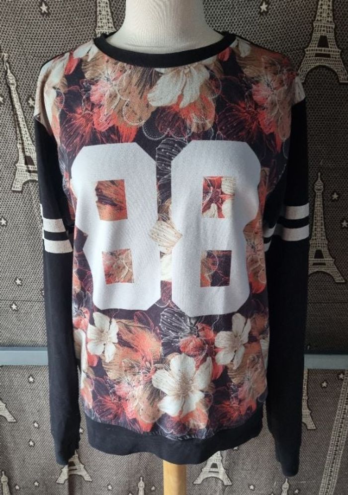 Sweat noir imprimé fleurs ,taille XL marque Sixth Hill,longueur 68cm, largeur 50,longueur épaule à aisselle 22cm, largeur aisselle à aisselle 53cm, longueur manche 62cm,légèrement craquelé sur les manches voir dernière photo.