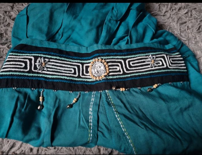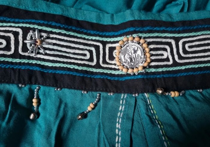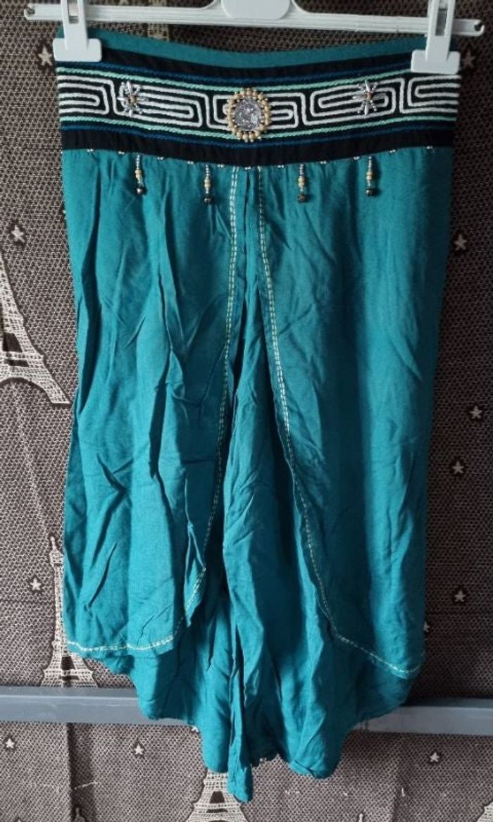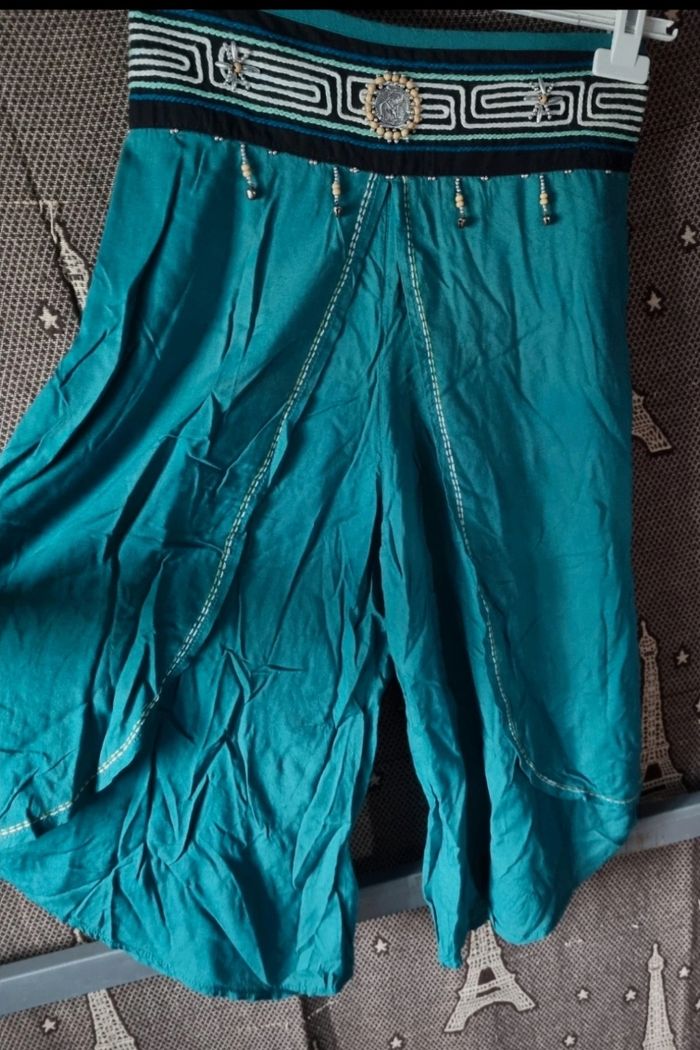 Pantalon jupe culotte verte taille 40-42, élastique à la taille, longueur 80cm, largeur de la taille 35cm jusqu'à 40cm, largeur cuisse 31cm.