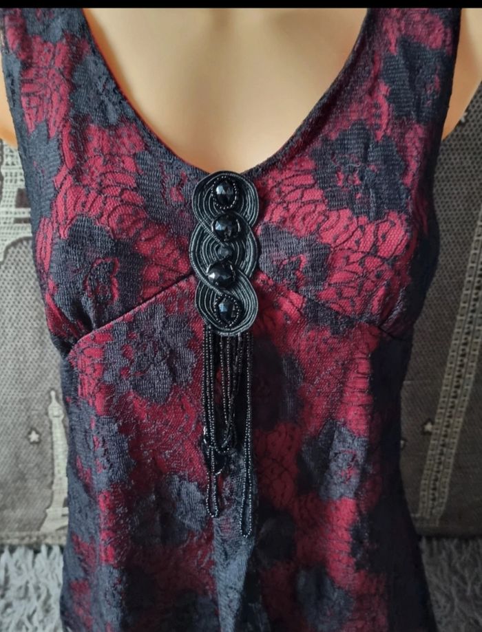 Haut rouge bordeaux à dentelle brodée taille 38-40, longueur 68cm, largeur 41cm ,longueur épaule à aisselle 18cm, largeur aisselle à aisselle 41cm.