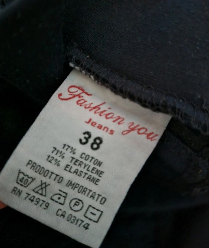 Pantalon marine élastique à la taille, marque Fashion You taille 38 mais conviendrait plus à 34-36, fausse poches, longueur 94cm, largeur de la taille 35cm, largeur cuisse 27cm,largeur cheville 13cm.