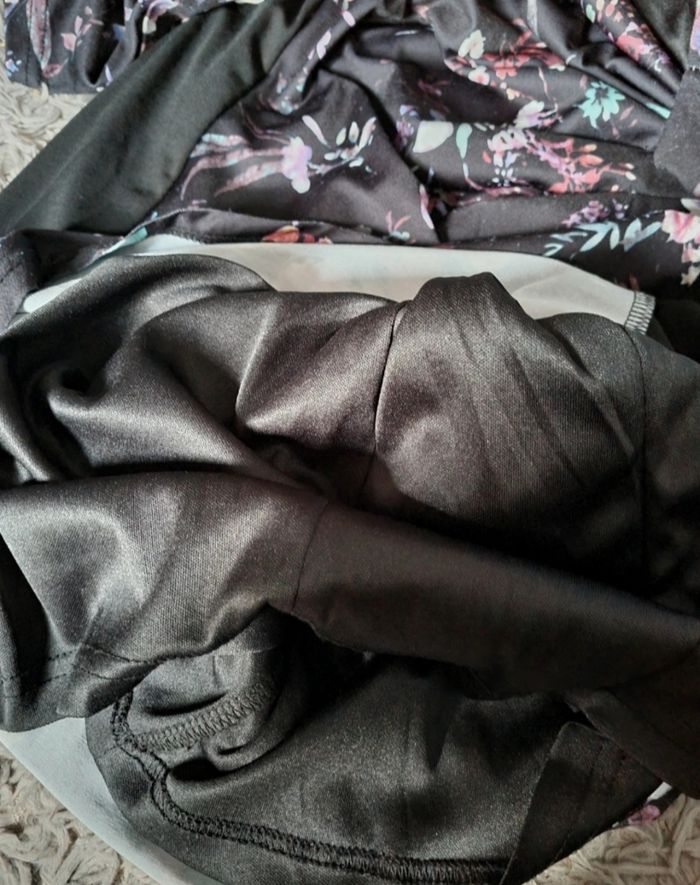 Robe noir à motifs fleurs manches longues, jupon intégré, taille 38 marque Norah,longueur 96cm ,largeur 44cm, longueur épaule à aisselle 21cm, largeur aisselle à aisselle 42cm, longueur manche 29cm, largeur épaule à épaule 38cm.