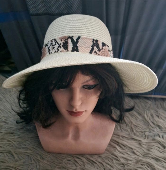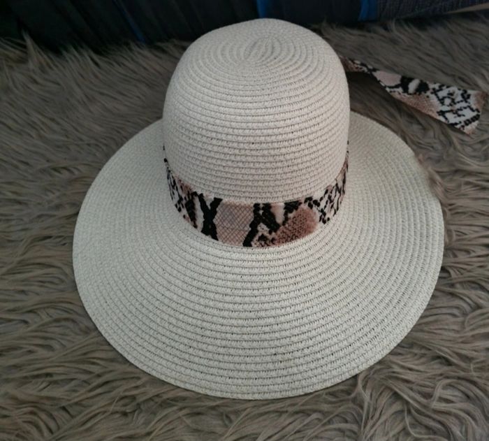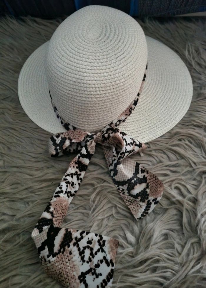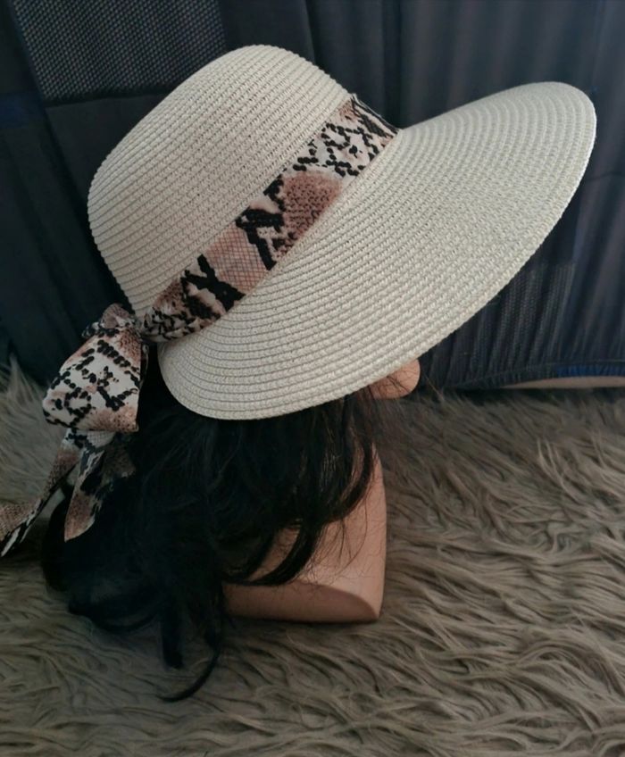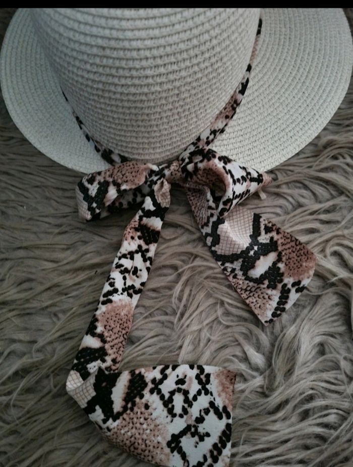 Chapeau crème avec bandeau motifs écailles serpent, taille environ 54-57cm.