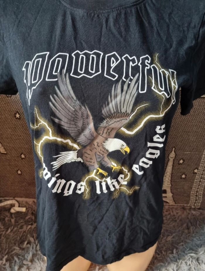 T-shirt noir imprimé aigle et éclair avec écriture, taille S marque FB Sister,longueur 57cm, largeur 42cm, longueur épaule à aisselle 18cm, largeur aisselle à aisselle 48cm.