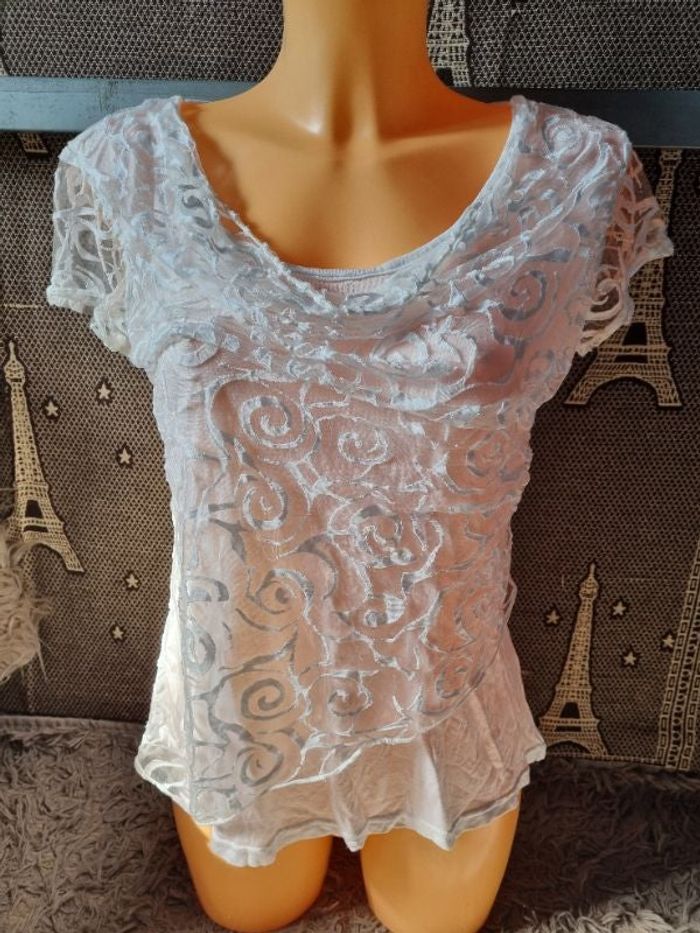 T-shirt blanc,taille 1 marque Made in italy, longueur 58cm, largeur 41cm, longueur épaule à aisselle 17cm, largeur aisselle à aisselle 46cm,une mini tache voir dernière photo.