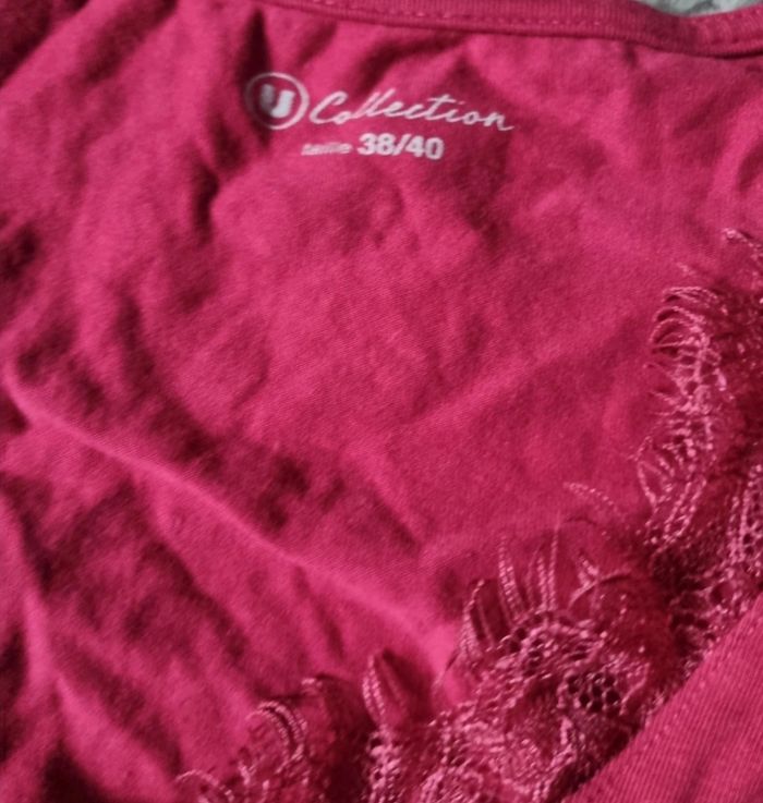 T-shirt à manches longues ,taille 38-40 marque U collection, longueur 60cm,largeur 45cm, longueur épaule à aisselle 18cm, largeur aisselle à aisselle 46cm, longueur manche 45cm,légère tache voir dernière photo.