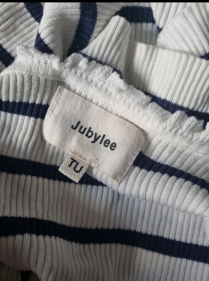 Débardeur côtelé à rayures style Marin, taille 34-36 marque Jubylee,longueur 53cm ,largeur 37cm, longueur épaule à aisselle 22cm, largeur aisselle à aisselle 36cm,couleur blanc cassé et marine.