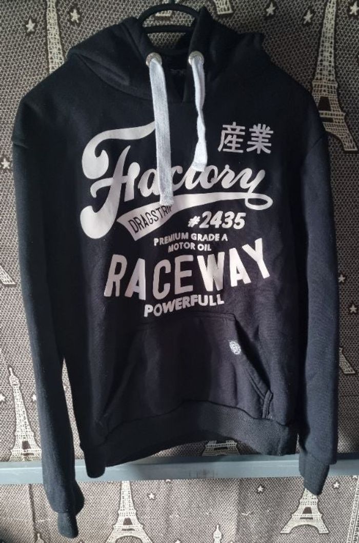 Sweat à capuche avec écriture, taille S marque Athl Sport, longueur 60cm, largeur 47cm ,longueur épaule à aisselle 20cm, largeur aisselle à aisselle 48cm, longueur manche 49cm, écriture légèrement craquelé.