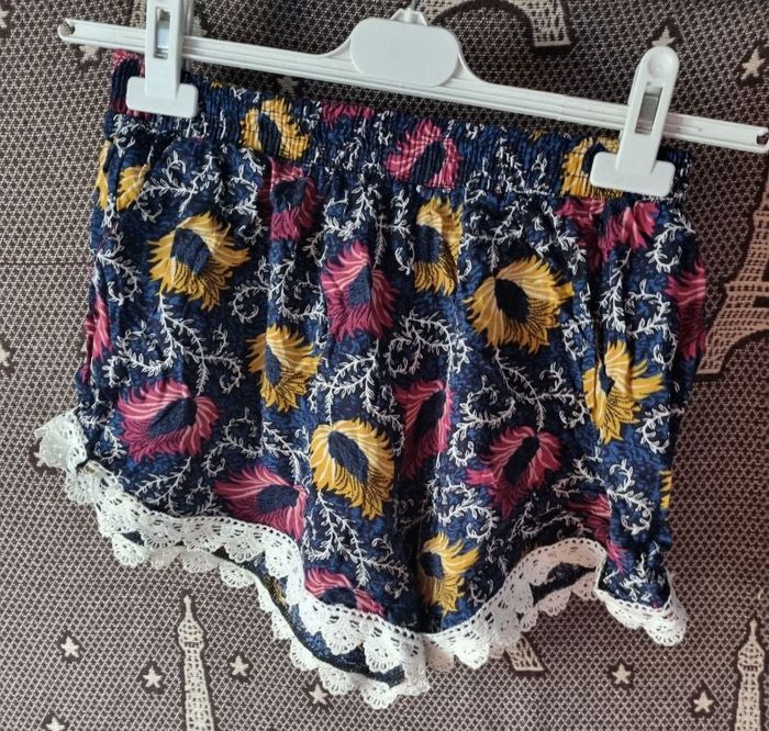 Short à motifs avec broderie taille M-L, élastique à la taille, 2 poches,longueur 26cm, largeur de la taille 30cm jusqu'à 40cm, largeur cuisse 35cm.