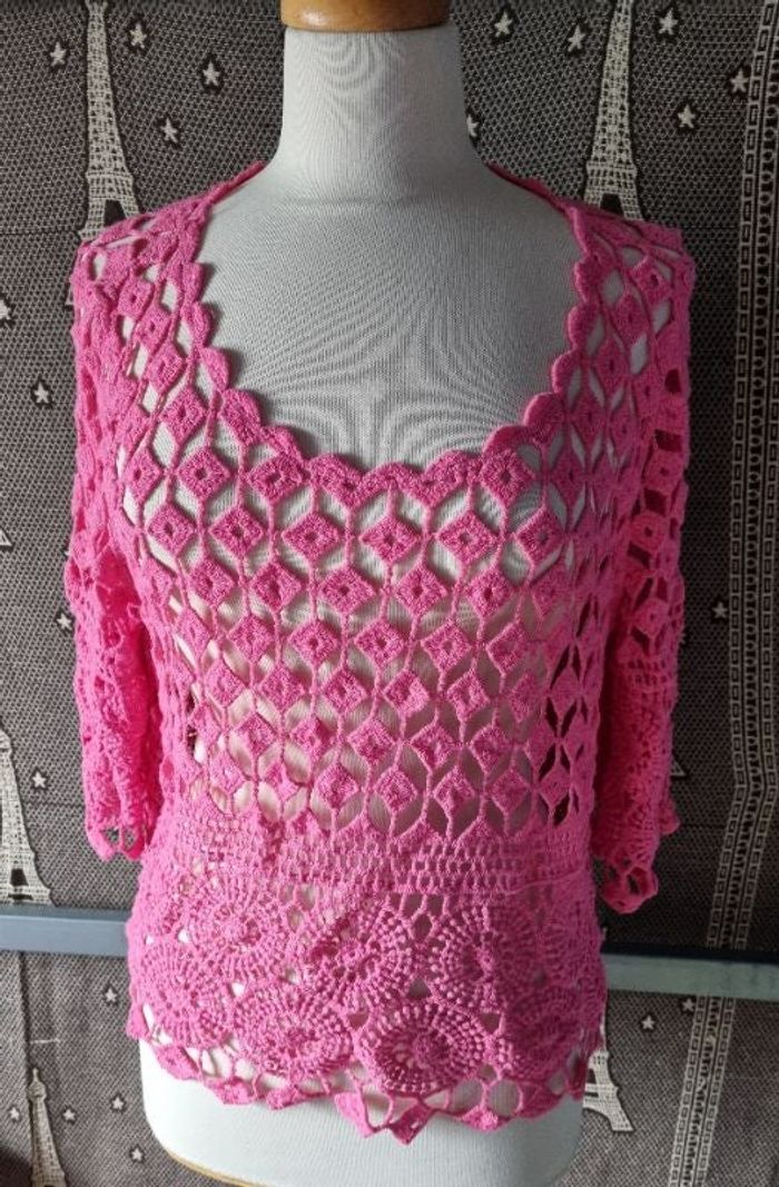 Haut rose brodé ajouré taille M,longueur 55cm, largeur 52cm, longueur épaule à aisselle 26cm, largeur aisselle à aisselle 53cm, longueur manche 23cm.