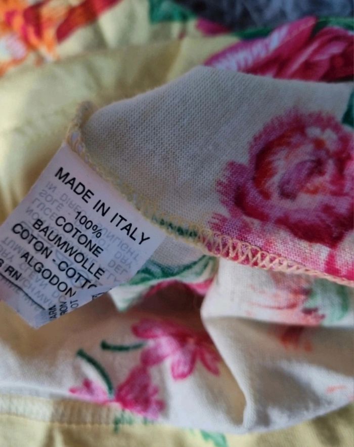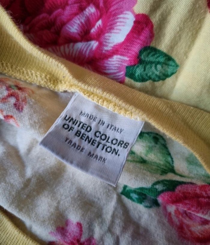 T-shirt jaune à fleurs, taille M marque United Colors Of Benetton,longueur 67cm, largeur 51cm, longueur épaule à aisselle 24cm, largeur aisselle à aisselle 56cm.