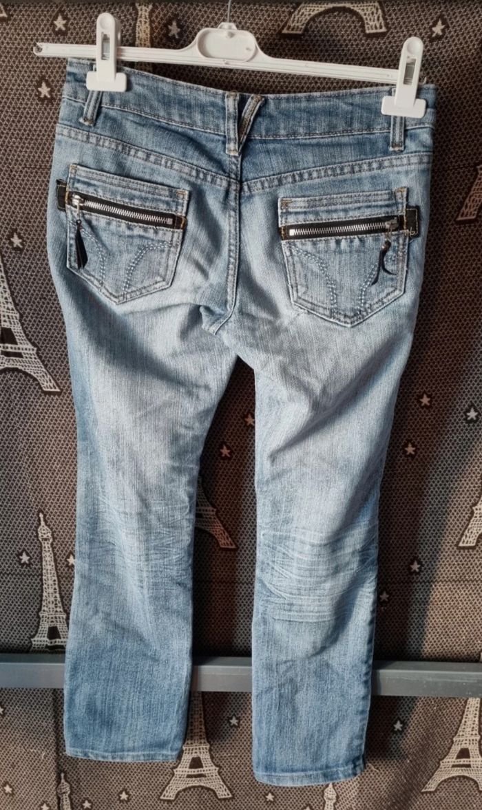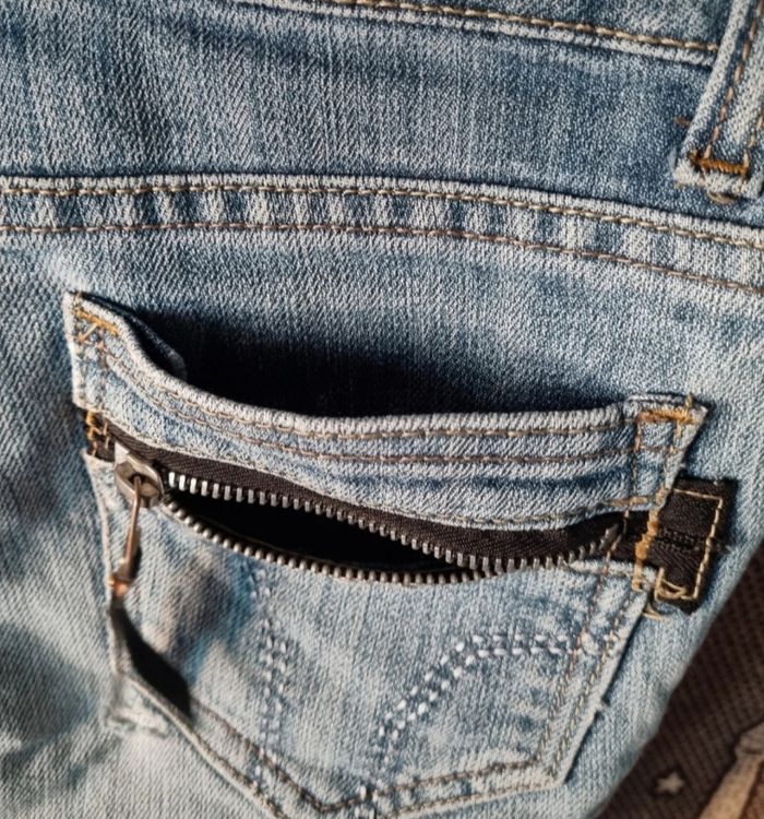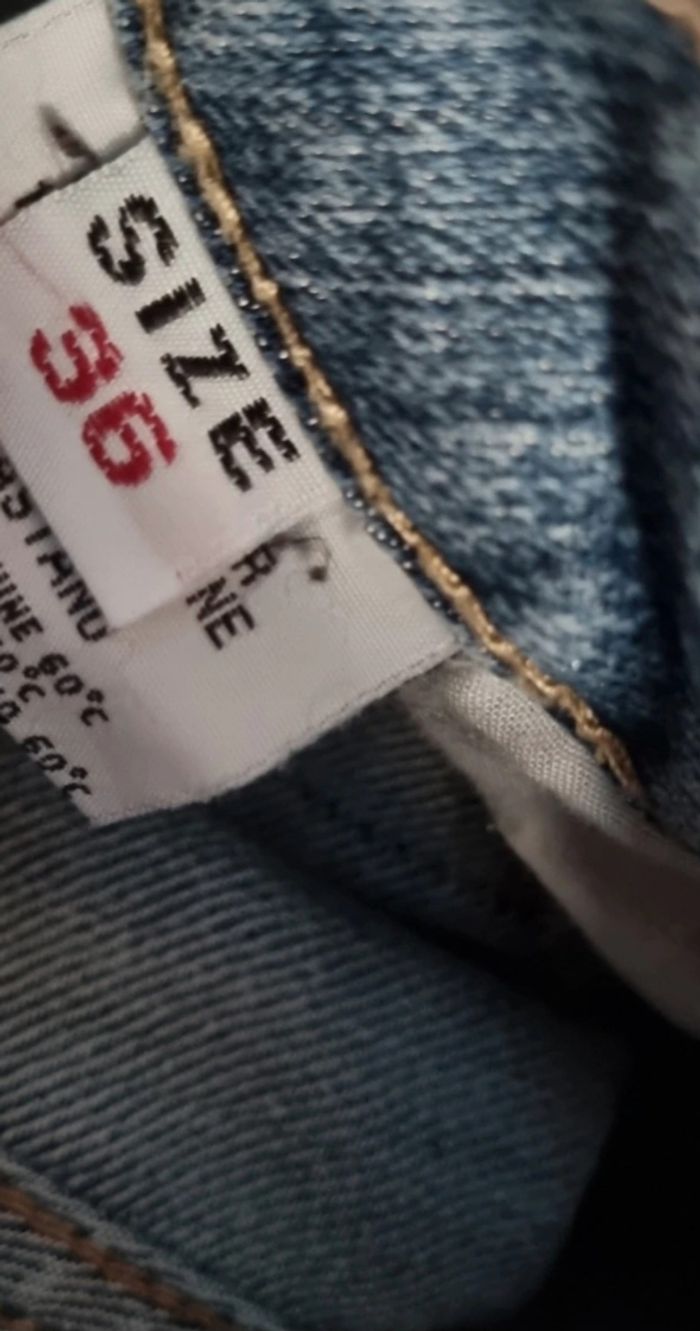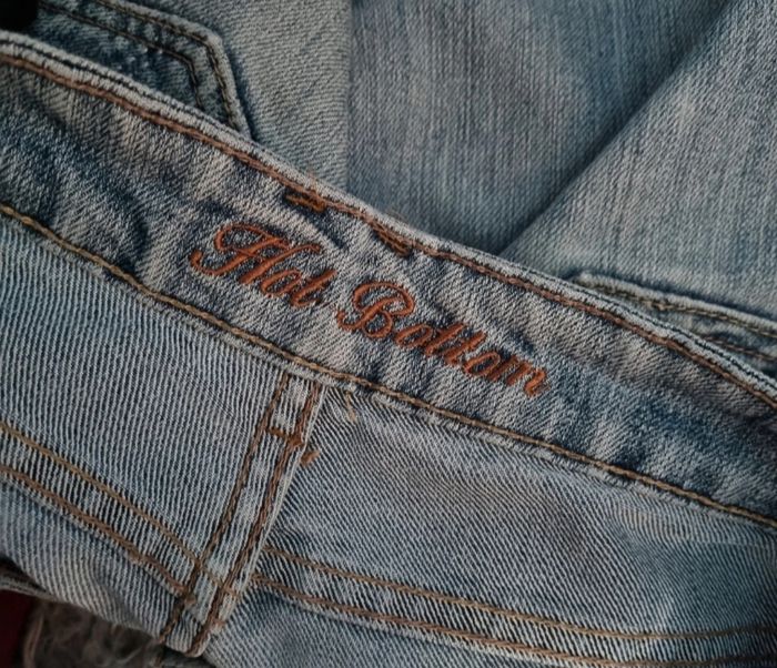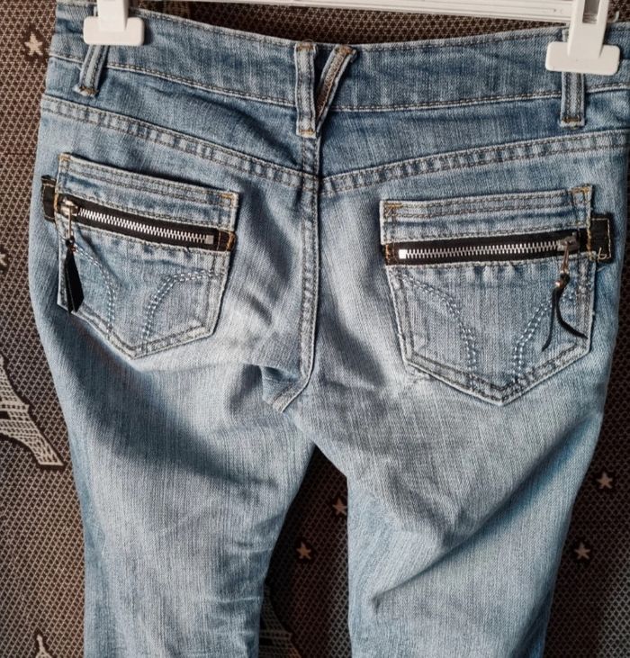 Jean effet délavé, taille 36 marque Hot Bottom,2 poches avant + une petite, 4 poches arrière 2 ouverte et 2 zippée (léger défaut sous une poche voir photo),fermeture zippée avec bouton, longueur 85cm, largeur de la taille 36cm, largeur cuisse 23cm, largeur cheville 15cm, peu porté.