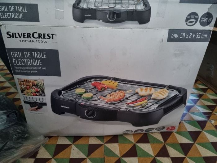 Gril de table électrique,marque Silvercrest avec livret , fonctionne très bien comme neuf servi une fois léger défaut dans le bac voir dernière photo, idéal pour le camping 🏕 ou les soirées grillade 🏡.