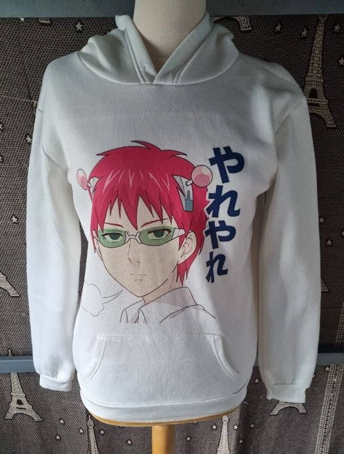 Sweat à capuche blanc imprimé Saiki Kusuo (My Hero Academia) taille M mixte,longueur 66cm, largeur 48cm, longueur épaule à aisselle 21cm, largeur aisselle à aisselle 51cm, longueur manche 56cm,intérieur chaud, légère tache voir dernière photo.