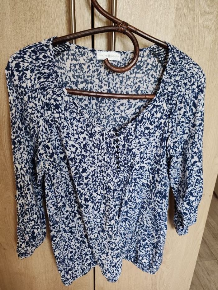 Matière fluide et légère à porter Col en V orné de 7 petits boutons avec bride de boutonnage Manches longues fermées par un petit bouton ou manches trois quart fermées avec une patte de boutonnage Longueur 60 cm- Largeur sous aisselles 56 cm environ Taille 40