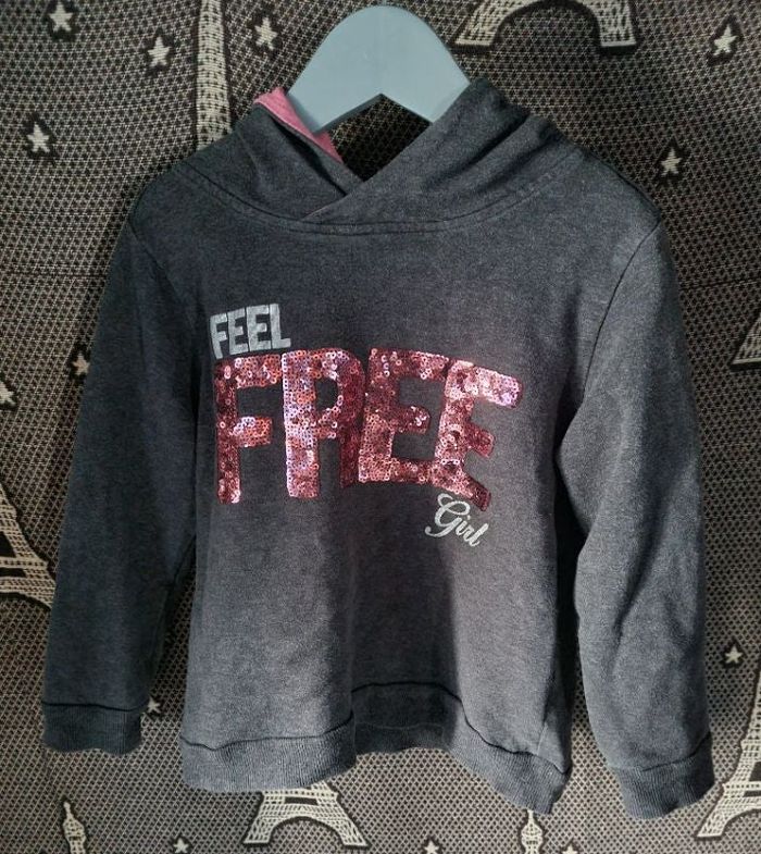 Sweat à capuche gris avec écriture en sequins taille 6ans ,très peut porté.