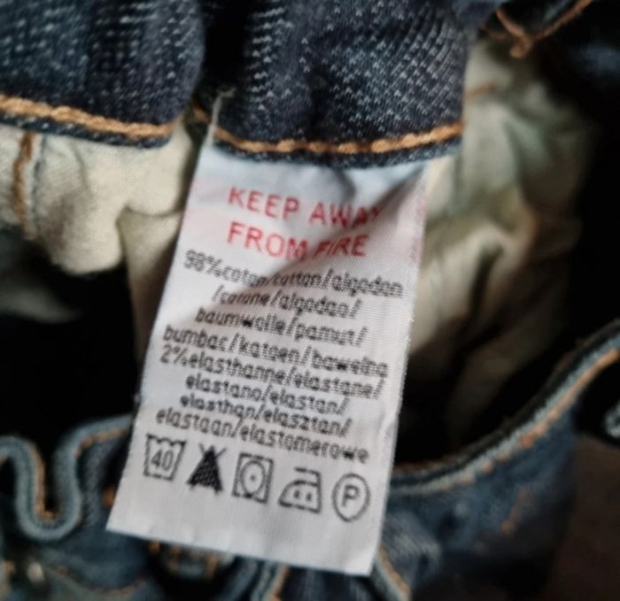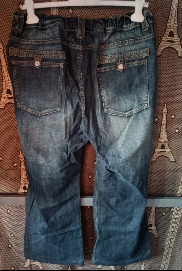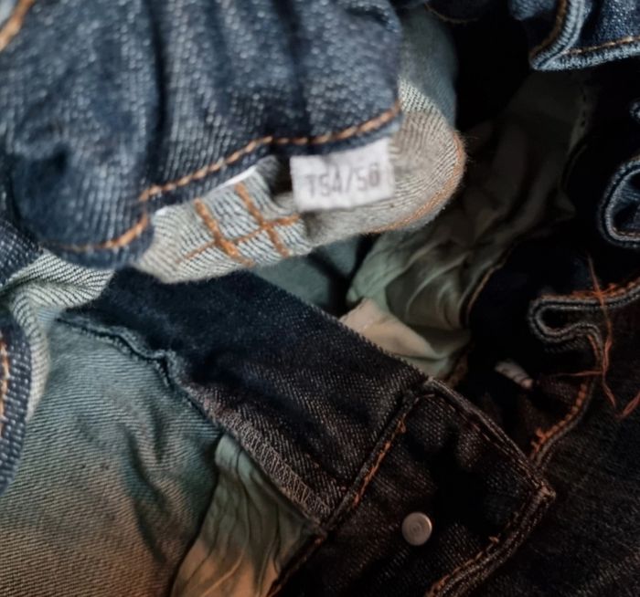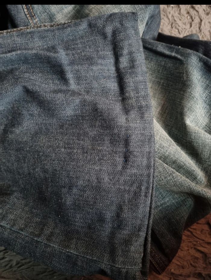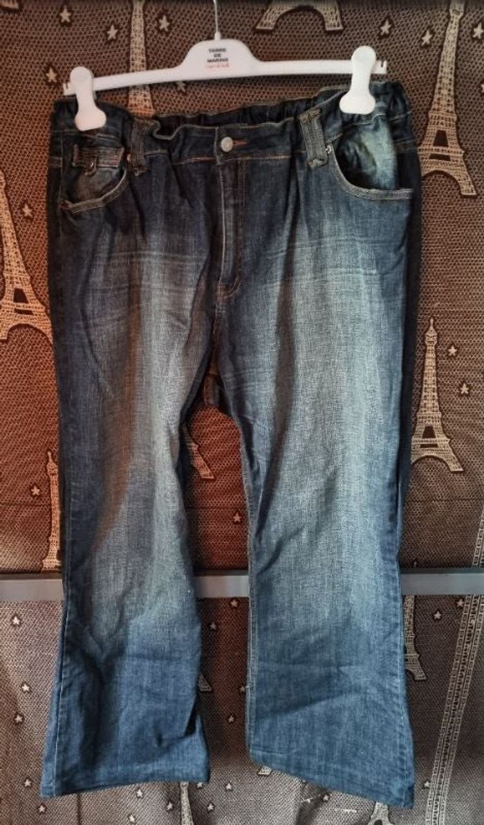 Jean effet délavé taille 54-56 ,élastique à la taille, longueur 102cm, largeur de la taille 38cm jusqu'à 55cm, largeur cuisse 34cm, largeur cheville 27cm, des ourlets on été fait voir dernière photo.