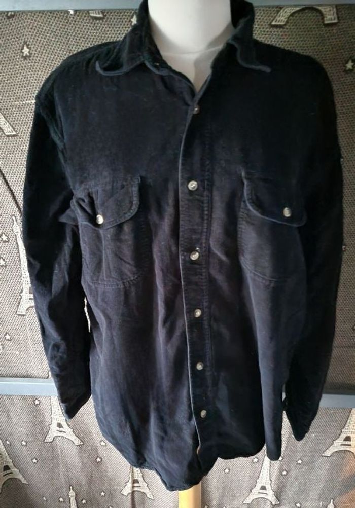 Chemise noir à manches longues taille M,fermeture à boutons, 2 poches, matière effet côtelé, longueur 66cm, largeur 60cm, longueur épaule à aisselle 22cm, largeur aisselle à aisselle 56cm, longueur manche 56cm.