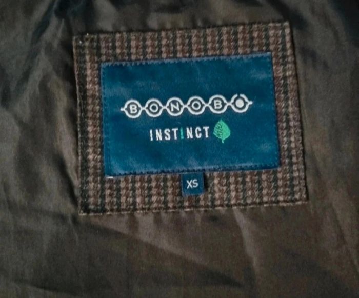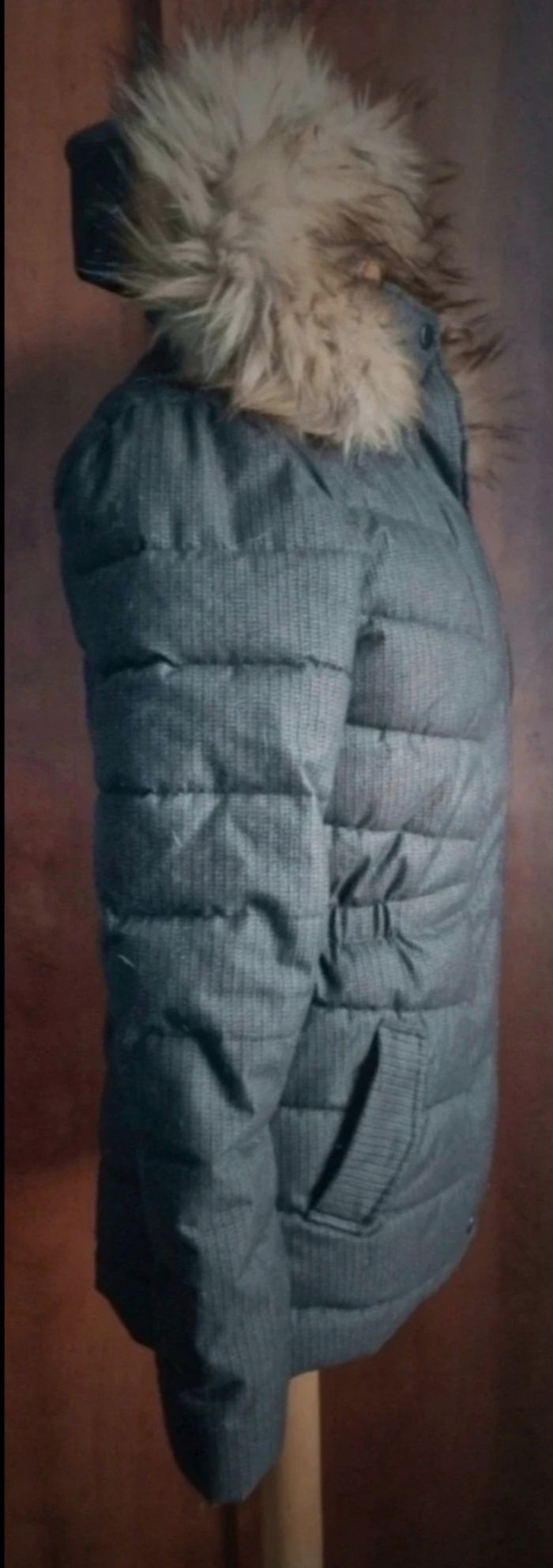 Manteau avec capuche à fausse fourrure, fermeture zippée avec pressions,taille XS marque Bonobo Instinct, longueur 71cm, largeur 41cm jusqu'à 44cm, longueur épaule à aisselle 22cm, largeur aisselle à aisselle 46cm, longueur manche 62cm, largeur épaule à épaule 38cm.