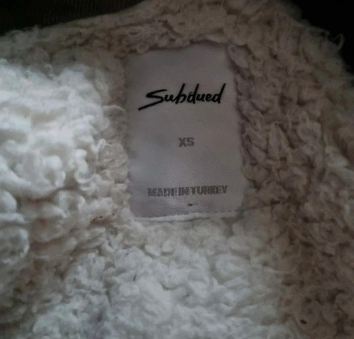 Veste zippée kaki avec écussons intérieur fourré (sauf dans les manches),2 poches,taille XS marque Subdued,longueur 57cm, largeur 45cm, longueur épaule à aisselle 21cm, largeur aisselle à aisselle 46cm, longueur manche 58cm, légèrement taché à l'intérieur voir photos .