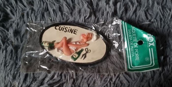 Plaque de porte humoristique 2ème version , pour cuisine, marque fox,largeur 12cm, hauteur 8cm,matière dur style céramique ou plâtre.