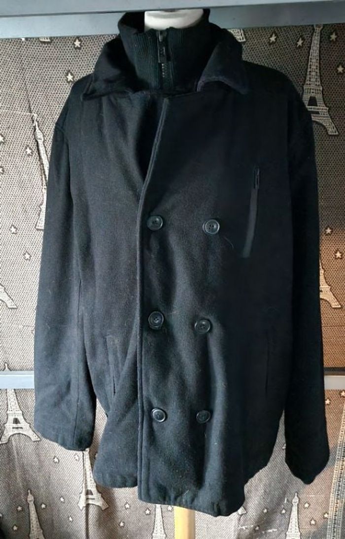 Caban noir intérieur doudoune, taille 2xl marque gémo, 3 poches extérieures 2 poches intérieure, fermeture zippée et boutons, longueur 75cm, largeur 59cm, longueur manche 56cm,largeur épaule à épaule 52cm, longueur épaule à aisselle 23cm,largeur aisselle à aisselle 60cm, peu porté.