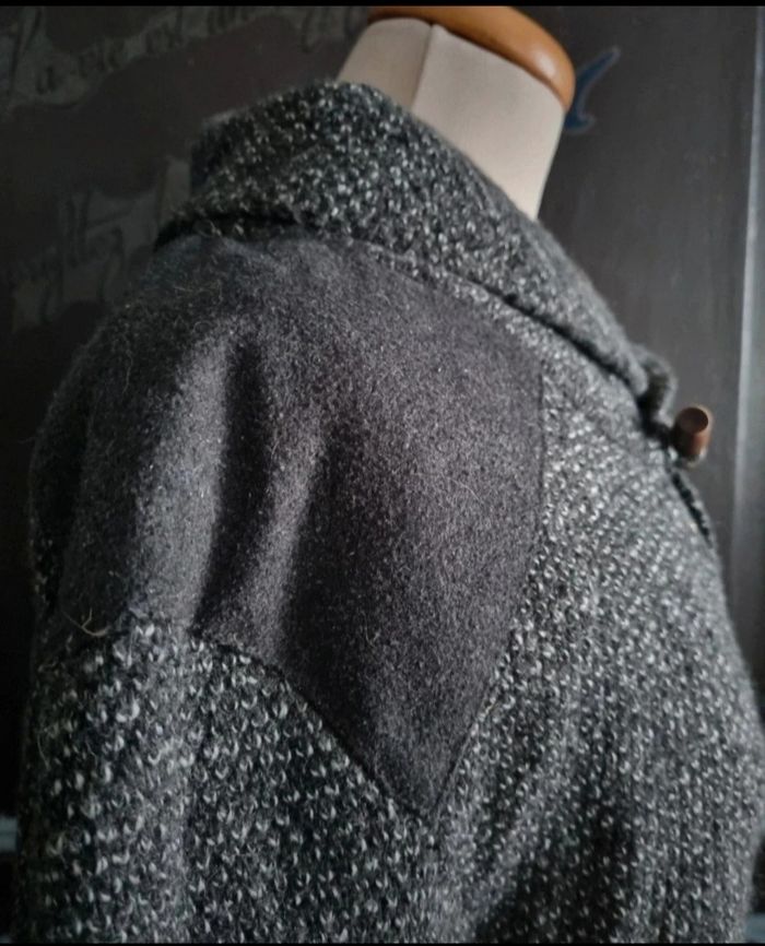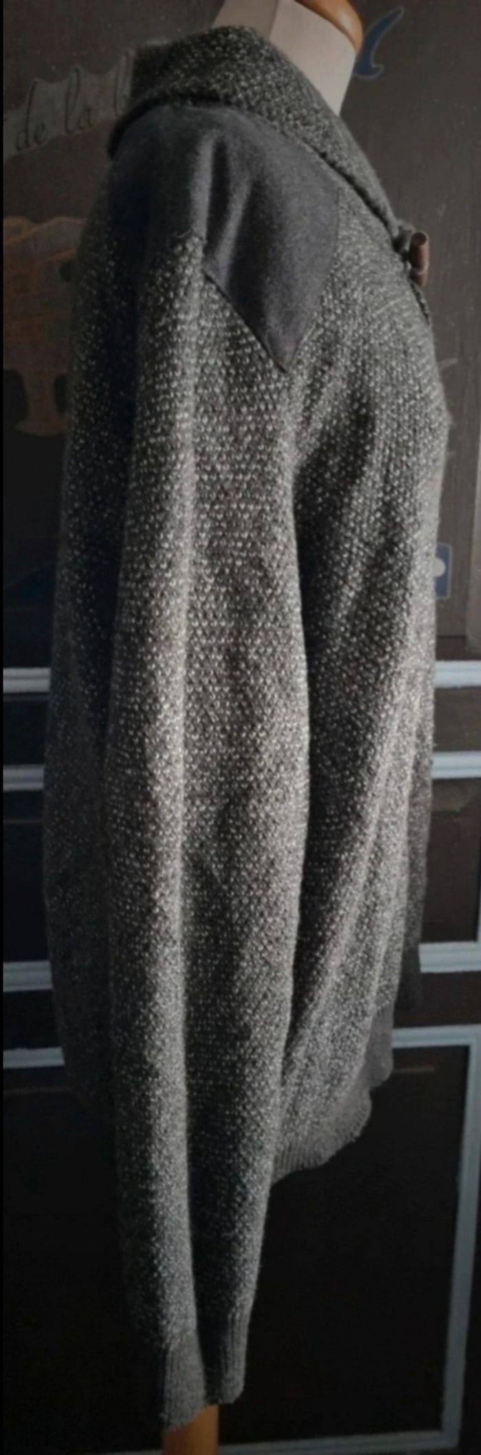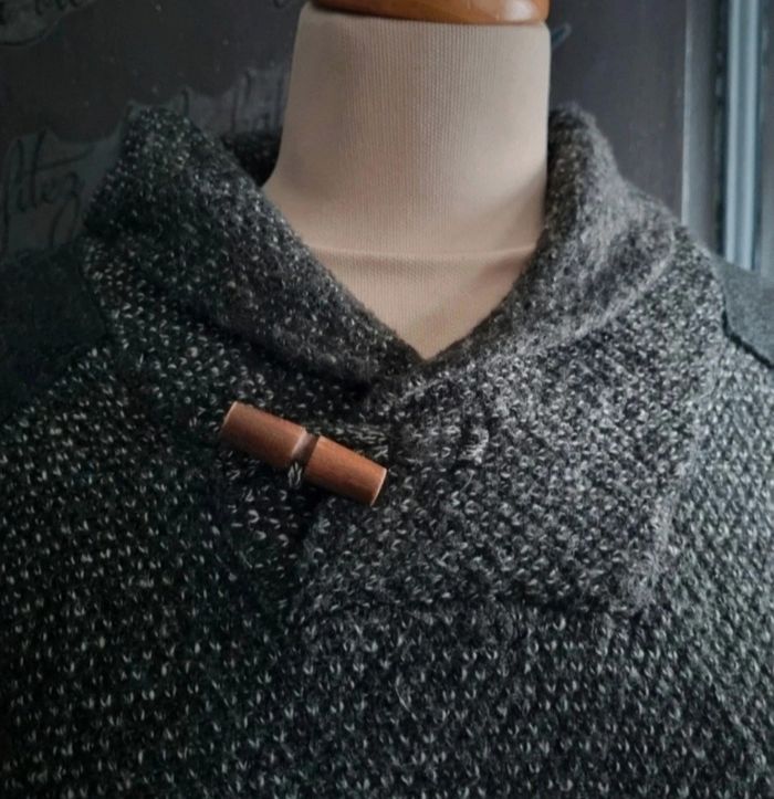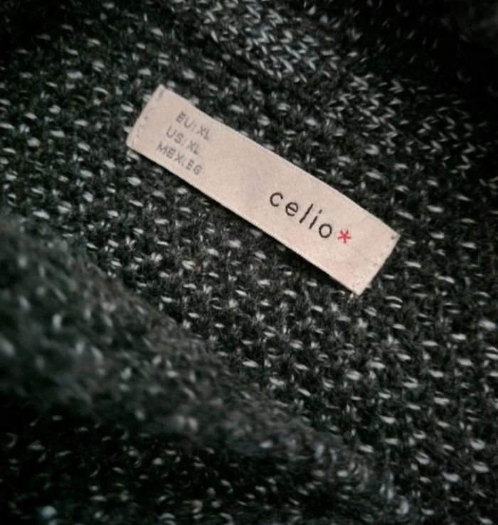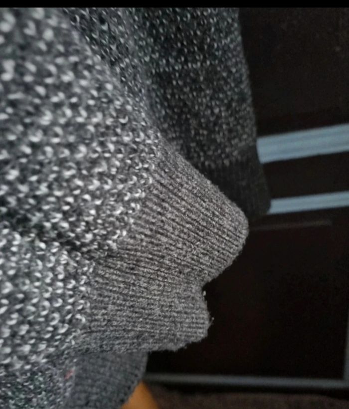 Pull à col noir au reflet gris, taille XL marque Celio, longueur 71cm, largeur 62cm, longueur épaule à aisselle 26cm, largeur aisselle à aisselle 67cm, longueur manche 66cm, mini trou voir dernière photo.