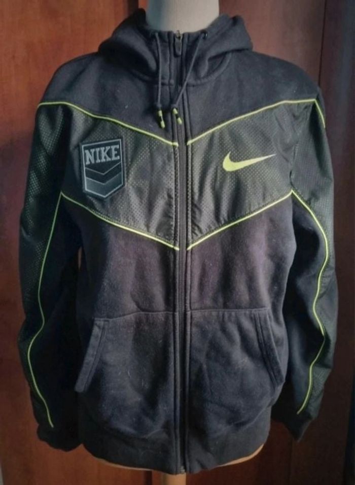 Veste de sport zippée à capuche ,taille M,marque Nike,noir et jaune fluo,intérieur chaud, longueur 67cm, largeur 52cm, longueur épaule à aisselle 26cm, longueur manche 65cm,mini tache voir dernière photo.