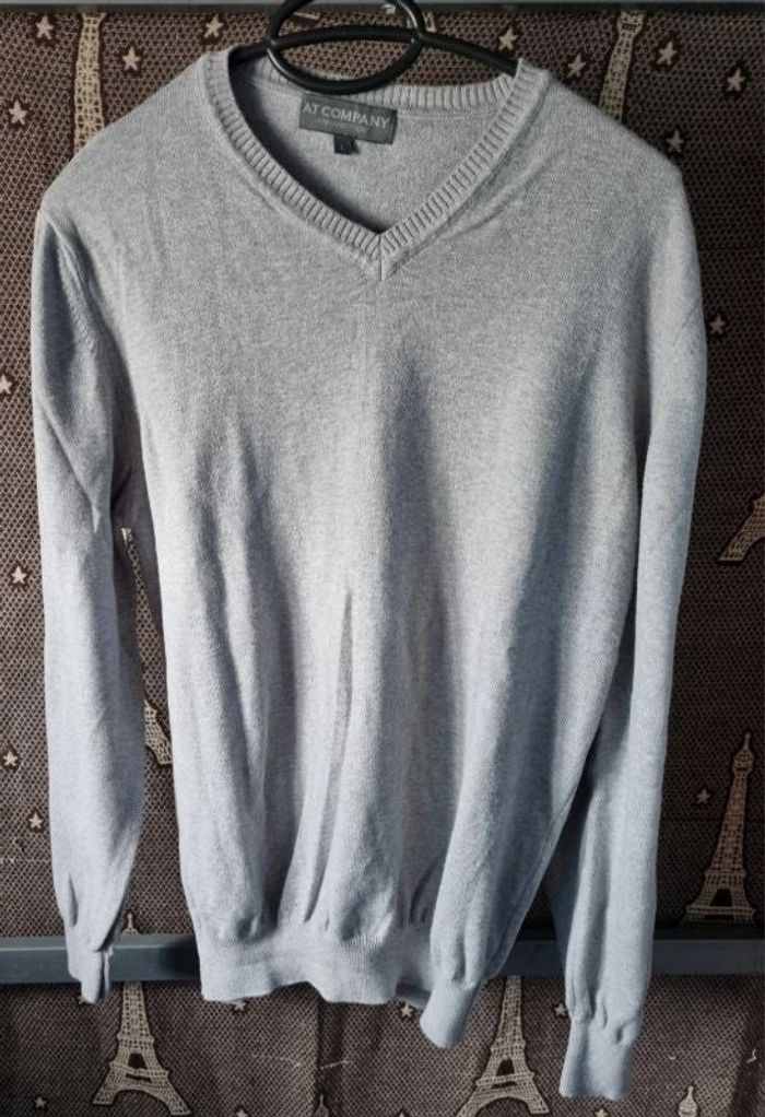 Pull gris clair, taille L marque At Company (Armand Thiery),longueur 65cm, largeur 46cm, longueur épaule à aisselle 24cm, largeur aisselle à aisselle 48cm,longueur manche 47cm.
