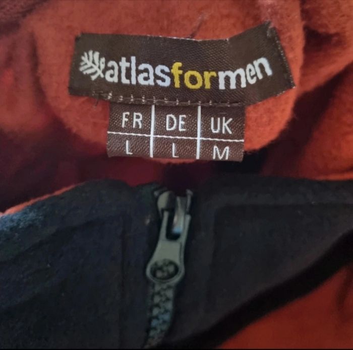 Veste zippée d'hiver couleur brique, taille L marque Atlas for Men,longueur 72cm, largeur 57cm, longueur épaule à aisselle 24cm, largeur aisselle à aisselle 57cm, longueur manche 56cm, très chaud.