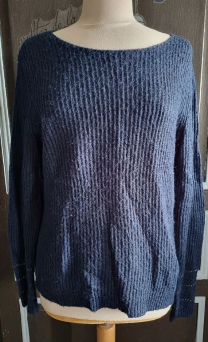 Pull marine taille M marque Camaïeu, longueur 60cm, largeur 48cm, longueur épaule à aisselle 20cm, largeur aisselle à aisselle 51cm, longueur manche 47cm.