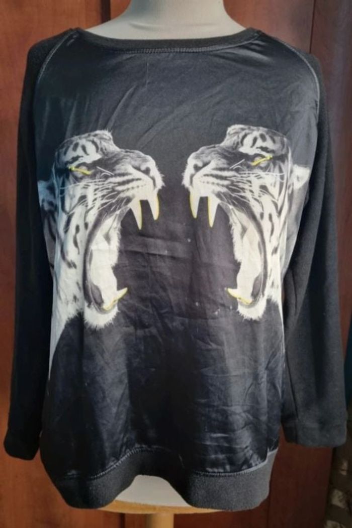 Sweat noir avec tigre imprimé, taille M marque Gémo, longueur 63cm, largeur 53cm, longueur épaule à aisselle 17cm, longueur manche 43cm,fils tiré à certains endroits voir photos.
