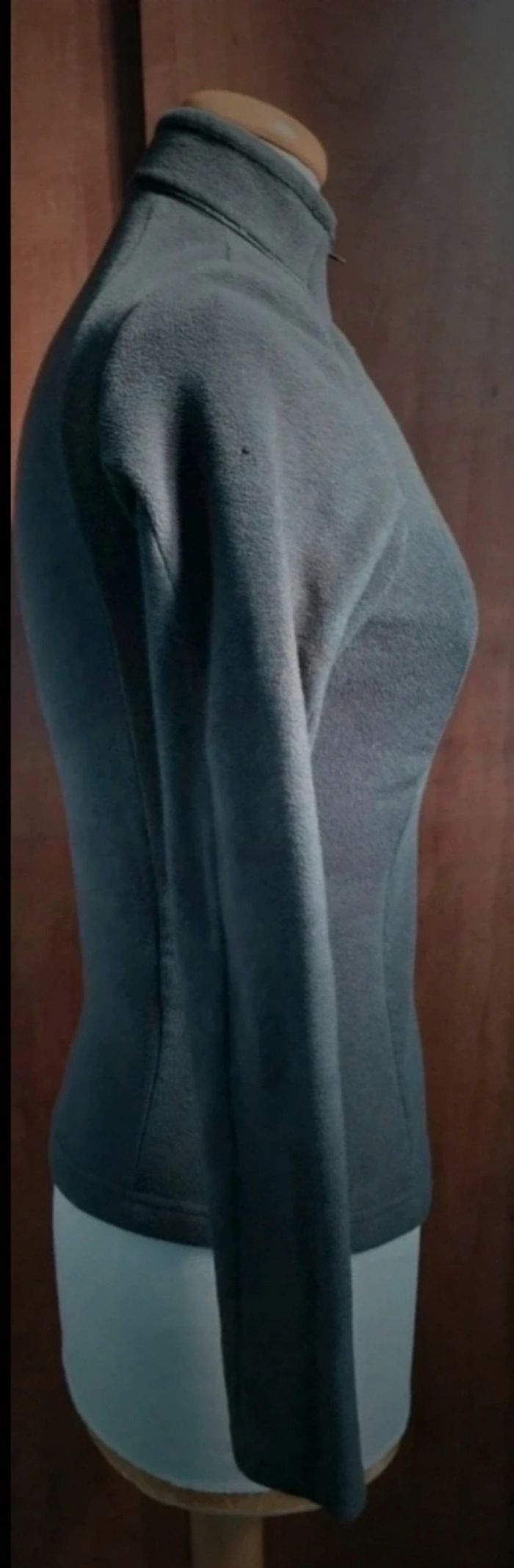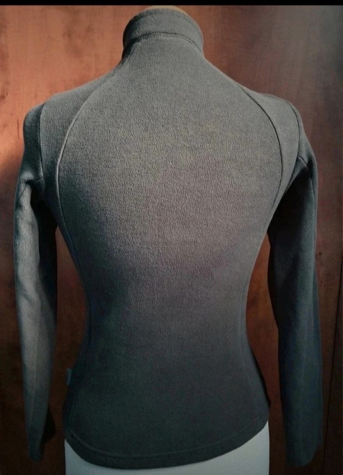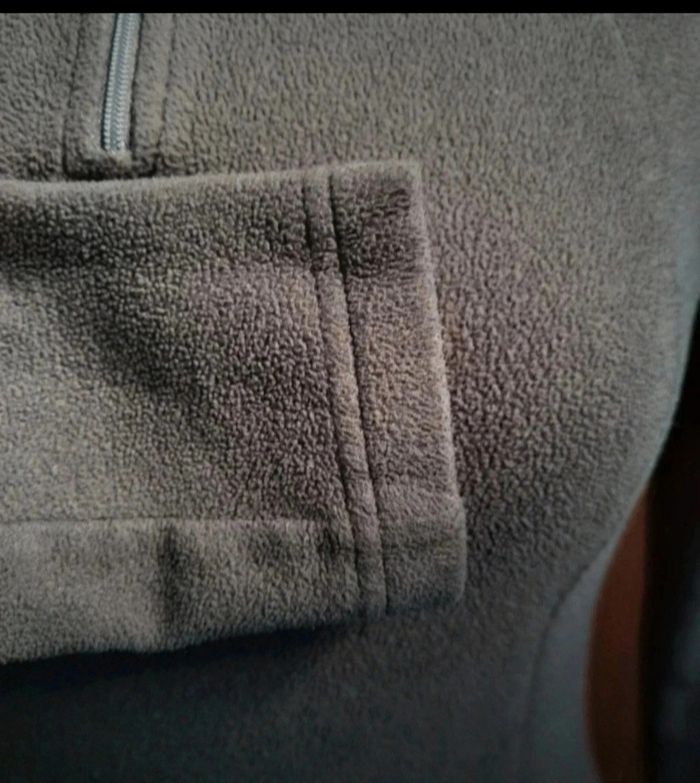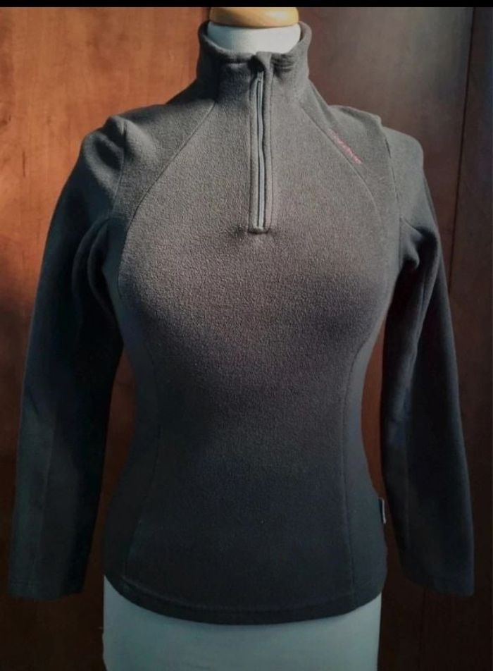 Pull d'hiver avec zip, taille XS marque Quechua, longueur 58cm, largeur 36cm, longueur manche 52cm, largeur aisselle à aisselle 38cm, longueur épaule à aisselle 18cm,gris foncé,mini trous voir dernière photo.