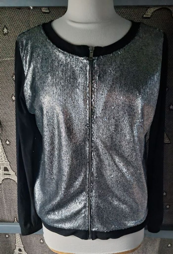Veste zippée noire à sequins argenté taille M,longueur 59cm, largeur 50cm, longueur épaule à aisselle 20cm, largeur aisselle à aisselle 49cm, longueur manche 46cm.