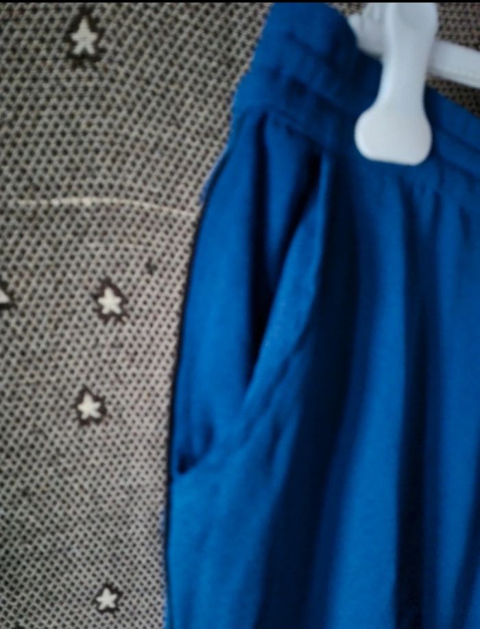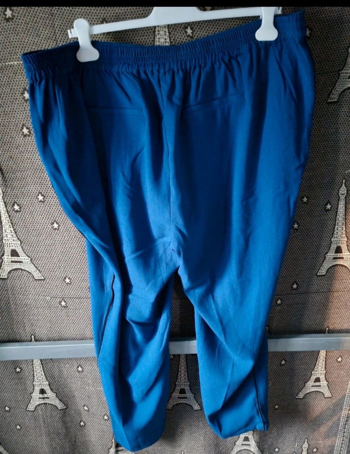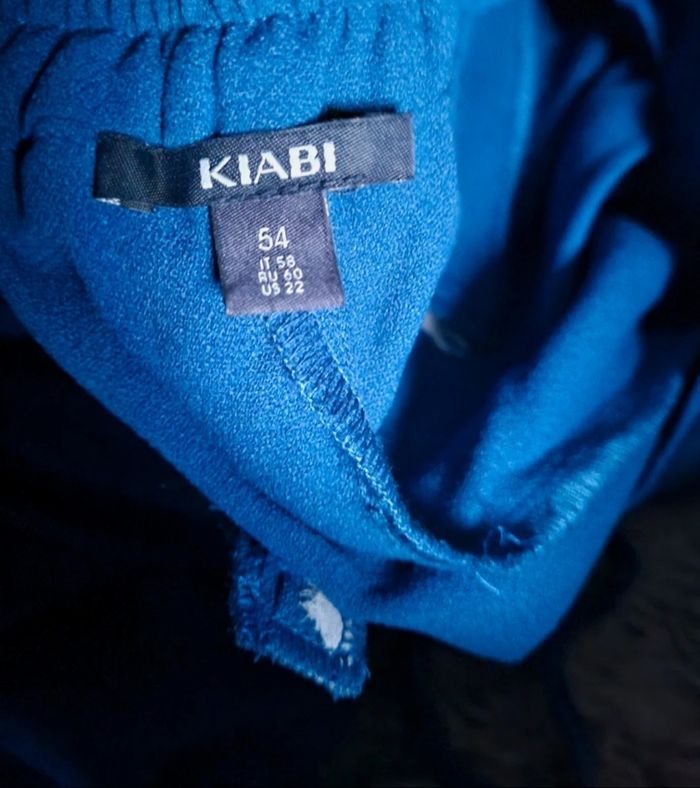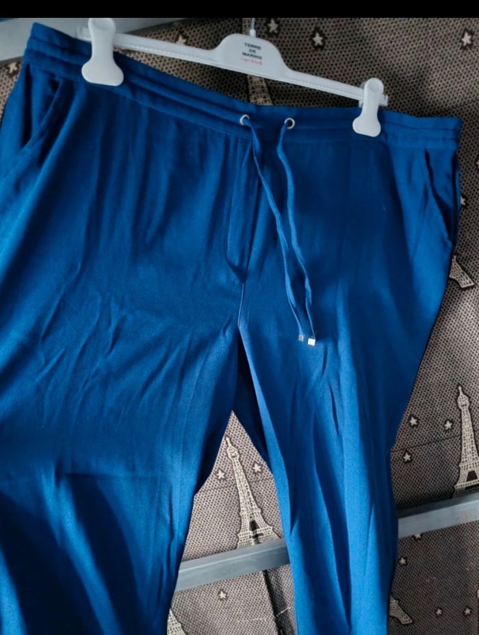 Pantalon bleu élastique à la taille avec cordon, taille 54 marque Kiabi, 2 vrais poches avant et fausse poches arrière, longueur 100cm, largeur de la taille 56cm jusqu'à 64cm,largeur cuisse 30cm, largeur cheville 20cm.