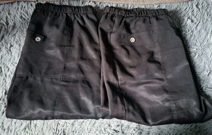 Lot 2 pantacourts noir taille 52-54, élastique à la taille, 2 poches, longueur 75cm, largeur de la taille 47cm jusqu'à 62cm, largeur cuisse 34cm.