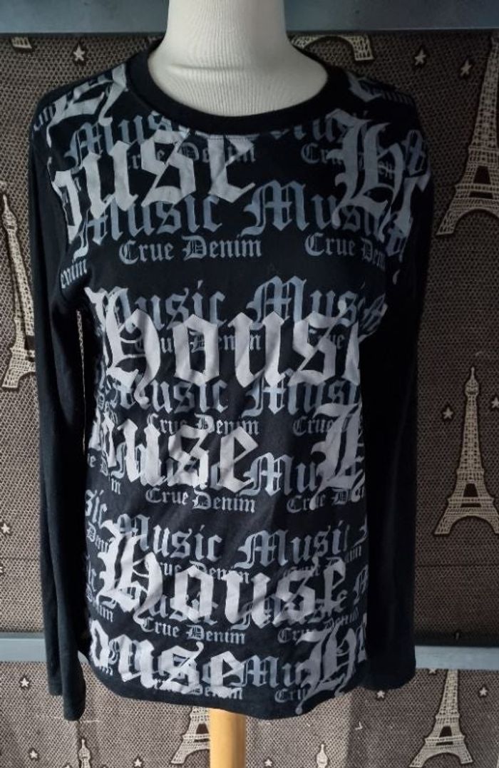 T-shirt à manches longues noir avec écriture gris taille XL, longueur 68cm, largeur 48cm, longueur épaule à aisselle 21cm, largeur aisselle à aisselle 49cm, longueur manche 53cm,(écriture légèrement craquelé).