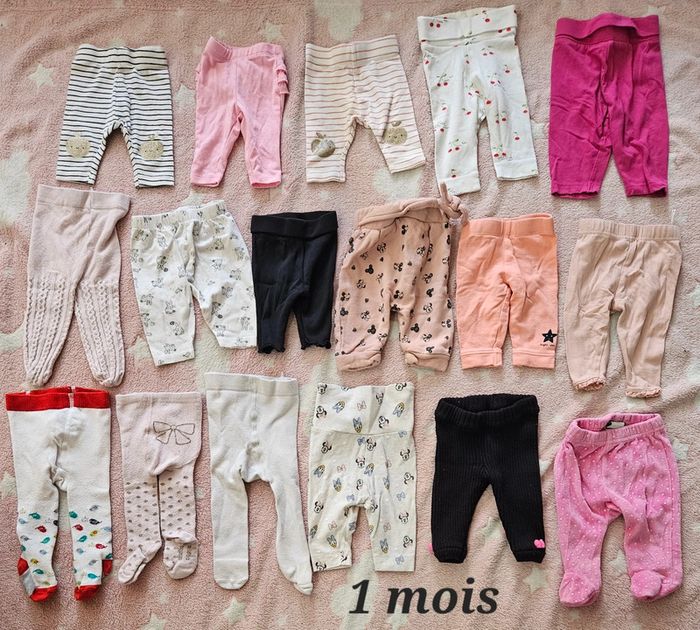 Gros lot de 17 vêtement bébé 1 mois. Pantalons, leggings, collants, jogging. - 1 jogging Disney - 10 leggings - 1 pantalon velours rose à poids avec pieds - 1 pantalon en laine, côtelé, avec un nœud rose de chaque côté - 4 collants, un blanc et rouge avec des poissons, un rose avec des poids et un nœud, un rose et 1 crème. Les collants ont été portés plusieurs fois mais ils sont en bon état, pas de trou ni de tâches. Le reste est en très bon état. -> Tous les articles que je vend sont propres, lavés juste avant la vente avec une lessive adaptée aux bébés. Sauf ceux qui sont neufs avec étiquette. Il faudra juste les repasser car je n'ai pas de fer à repasser. #mathilde06000_enfant_1mois