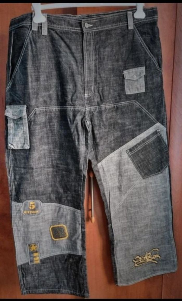 Baggy noir et gris avec motifs taille 52 ,100%coton, longueur 110cm ,largeur de la taille 58cm,largeur cuisse 37cm, largeur cheville 31cm. Prix négociable dans la limite du raisonnable Merci.