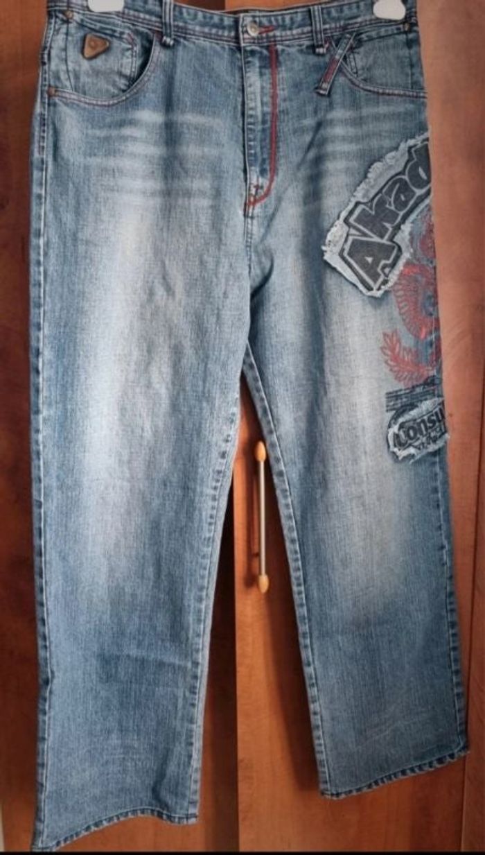 Pantalon baggy en jeans, old school bleu avec grand motifs sur la cuisse gauche qui fait l'avant et l'arrière de la cuisse, marque akademiks,taille 36 US (46FR),100%coton , longueur 114cm ,largeur de la taille 46cm,largeur cuisse 34cm, longueur entre jambes 40cm, largeur cheville 26cm, légèrement usé en bas des cheville sinon très bonne état. Prix négociable dans la limite du raisonnable Merci