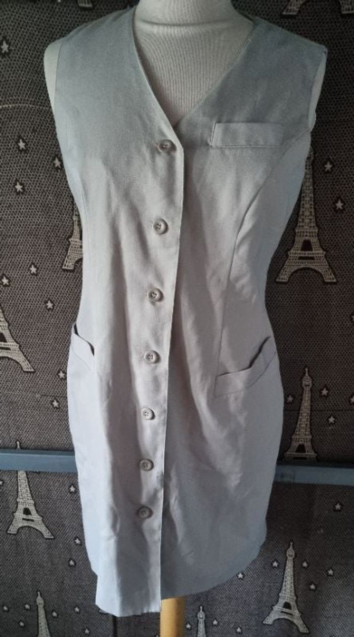 Longue veste sans manche ou robe ,à boutons,3 poches, taille 42,réglable au dos,longueur 91cm, largeur 51cm, longueur épaule à aisselle 18cm, largeur aisselle à aisselle 45cm, largeur épaule à épaule 33cm.