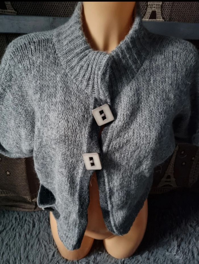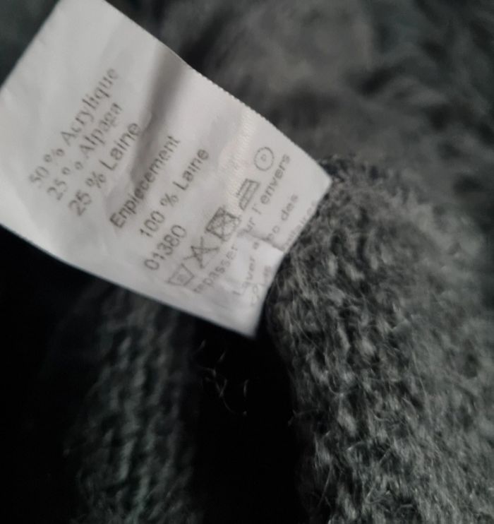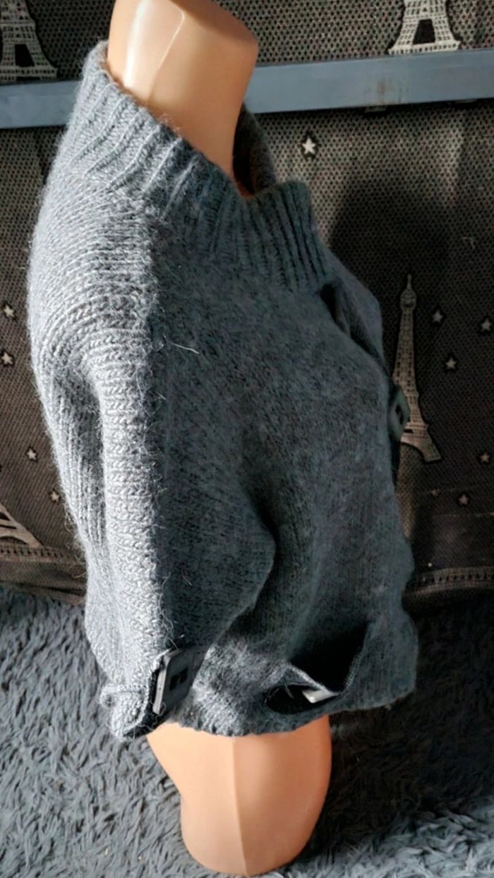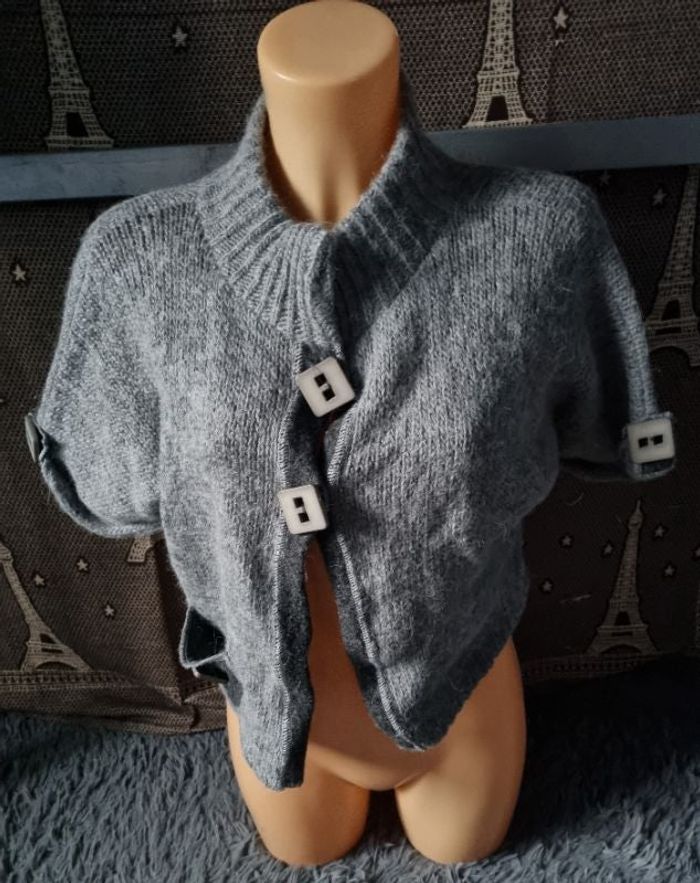Cardigan gris à 2 boutons ,une petite poche,taille 2 marque Patrice Breal, longueur 45cm, largeur 46cm, longueur épaule à aisselle 20cm, largeur aisselle à aisselle 51cm, longueur manche 13cm.