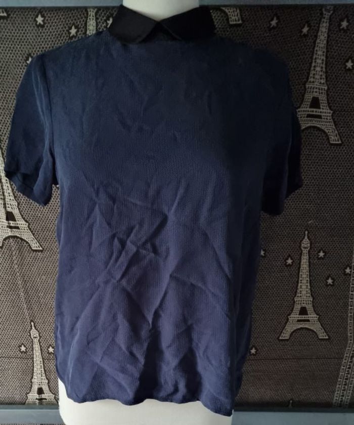 T-shirt marine avec col boutonnée à l'arrière, taille M marque On You,100% Cupro,longueur 59cm, largeur 51cm, longueur épaule à aisselle 17cm, largeur aisselle à aisselle 48cm.